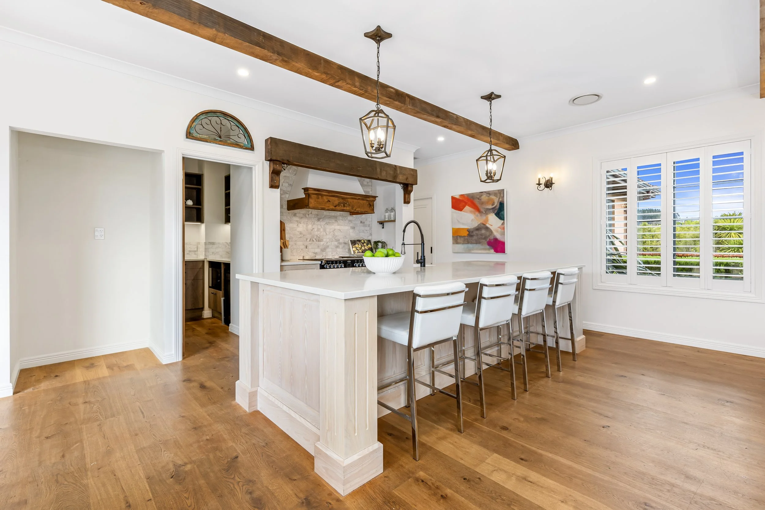 Designed with an emphasis on effortless indoor-outdoor living, the home features expansive entertaining spaces, including an outdoor area complete with a wood-fired pizza oven. The exquisite timber beams and oak flooring throughout add warmth and character, creating the perfect setting for hosting family and friends.