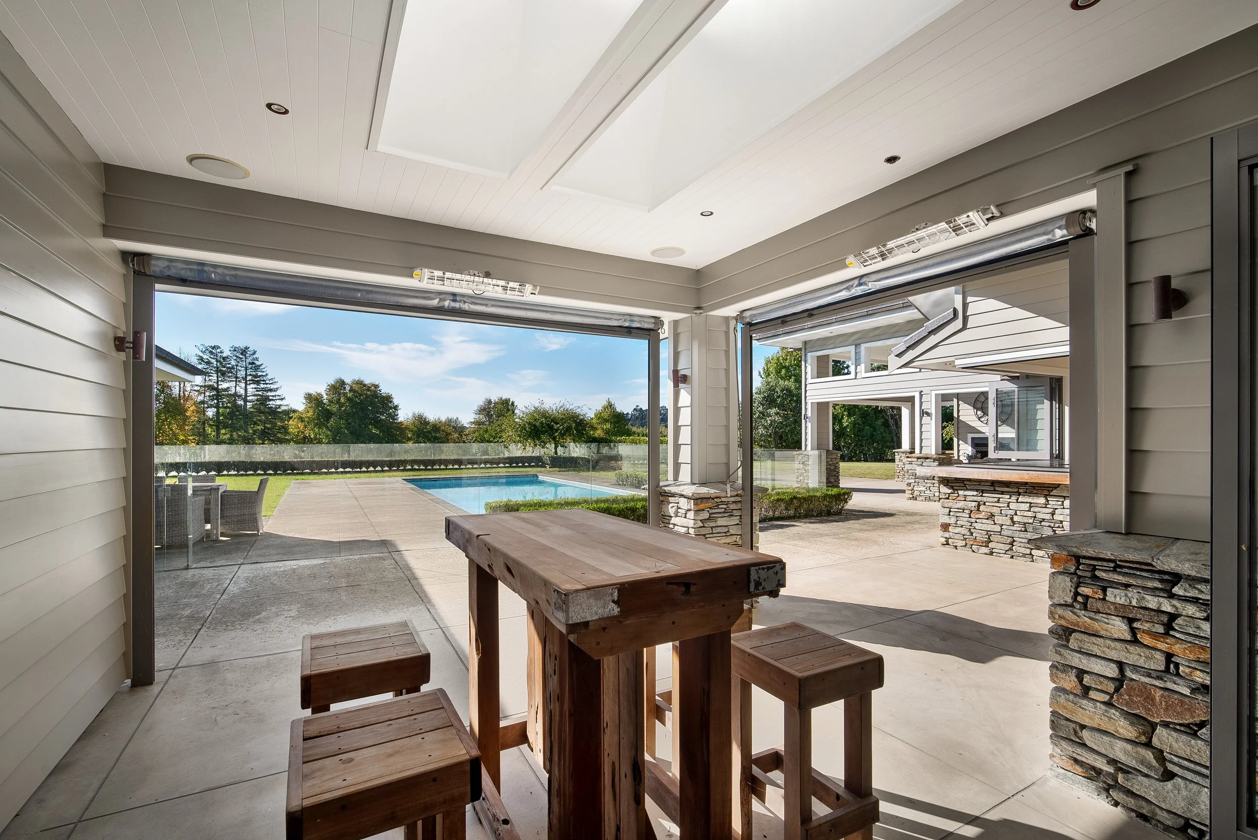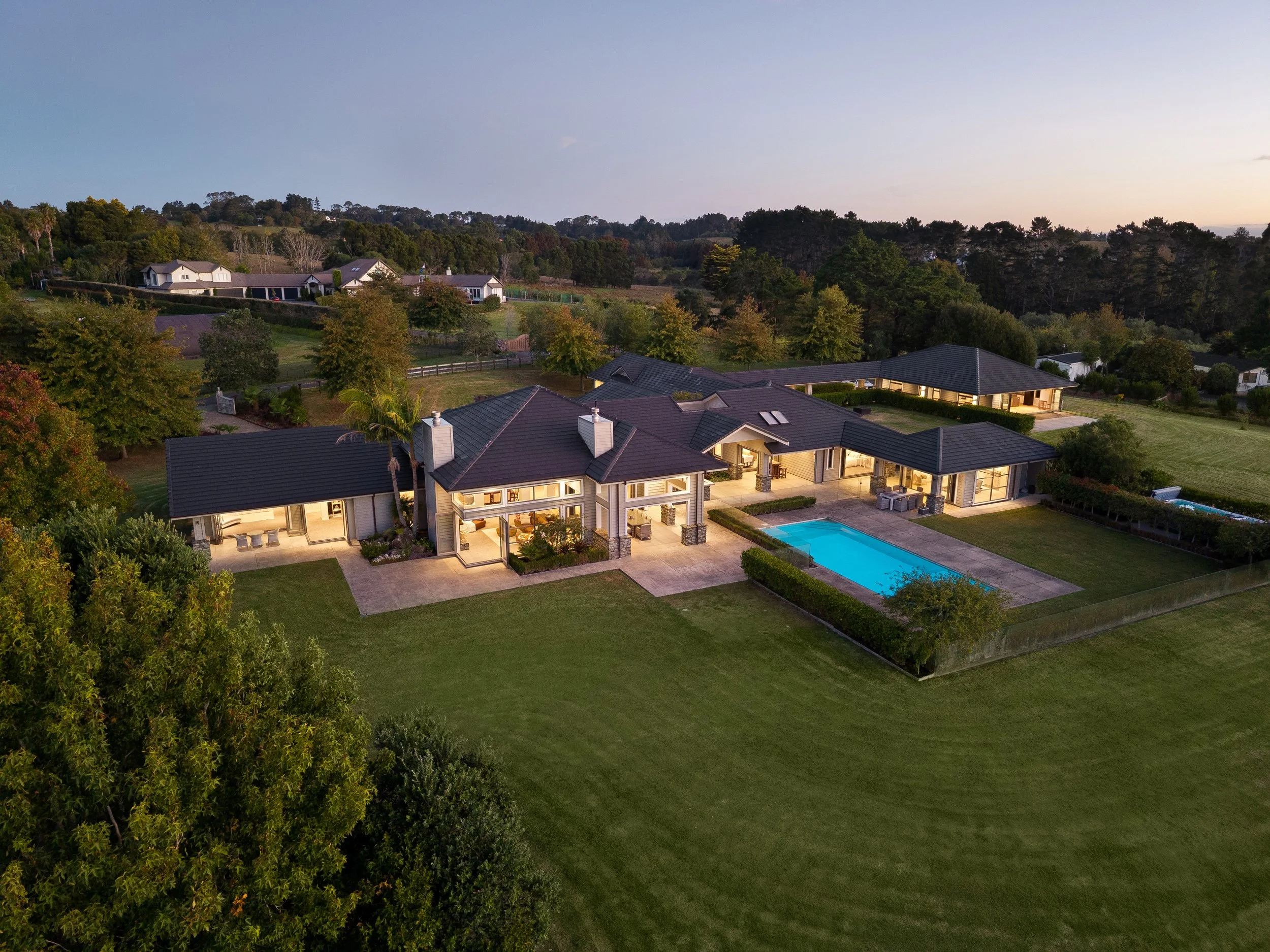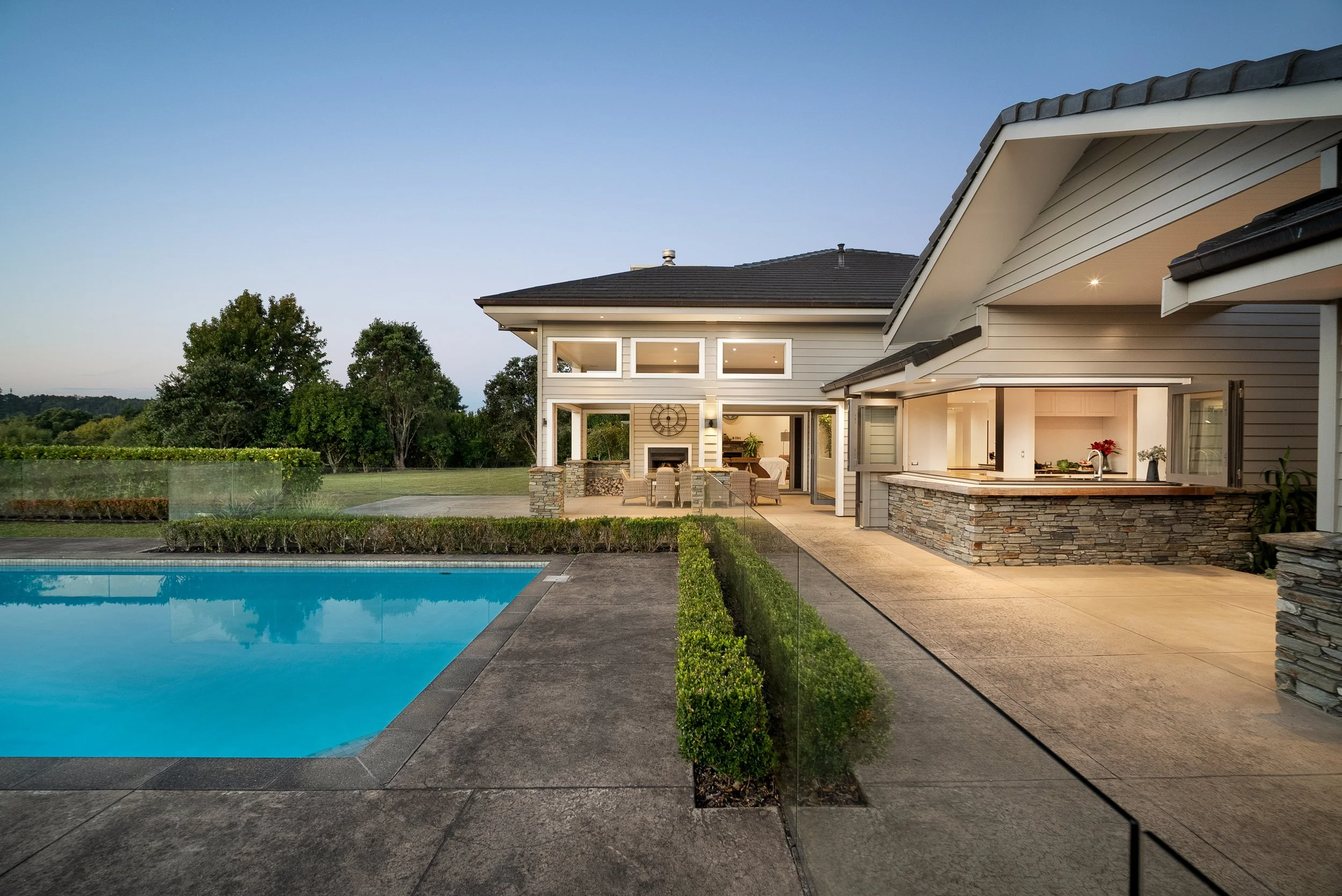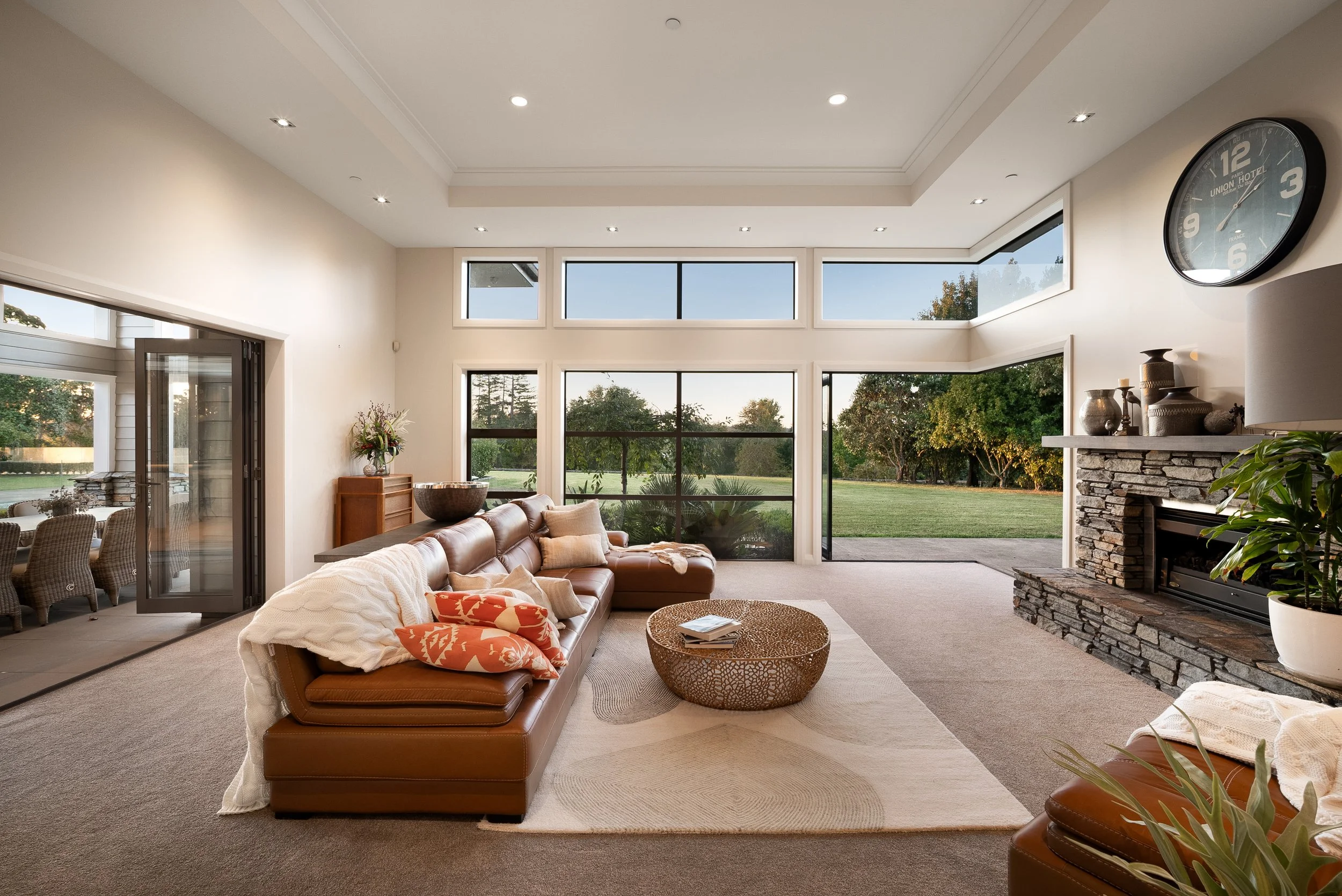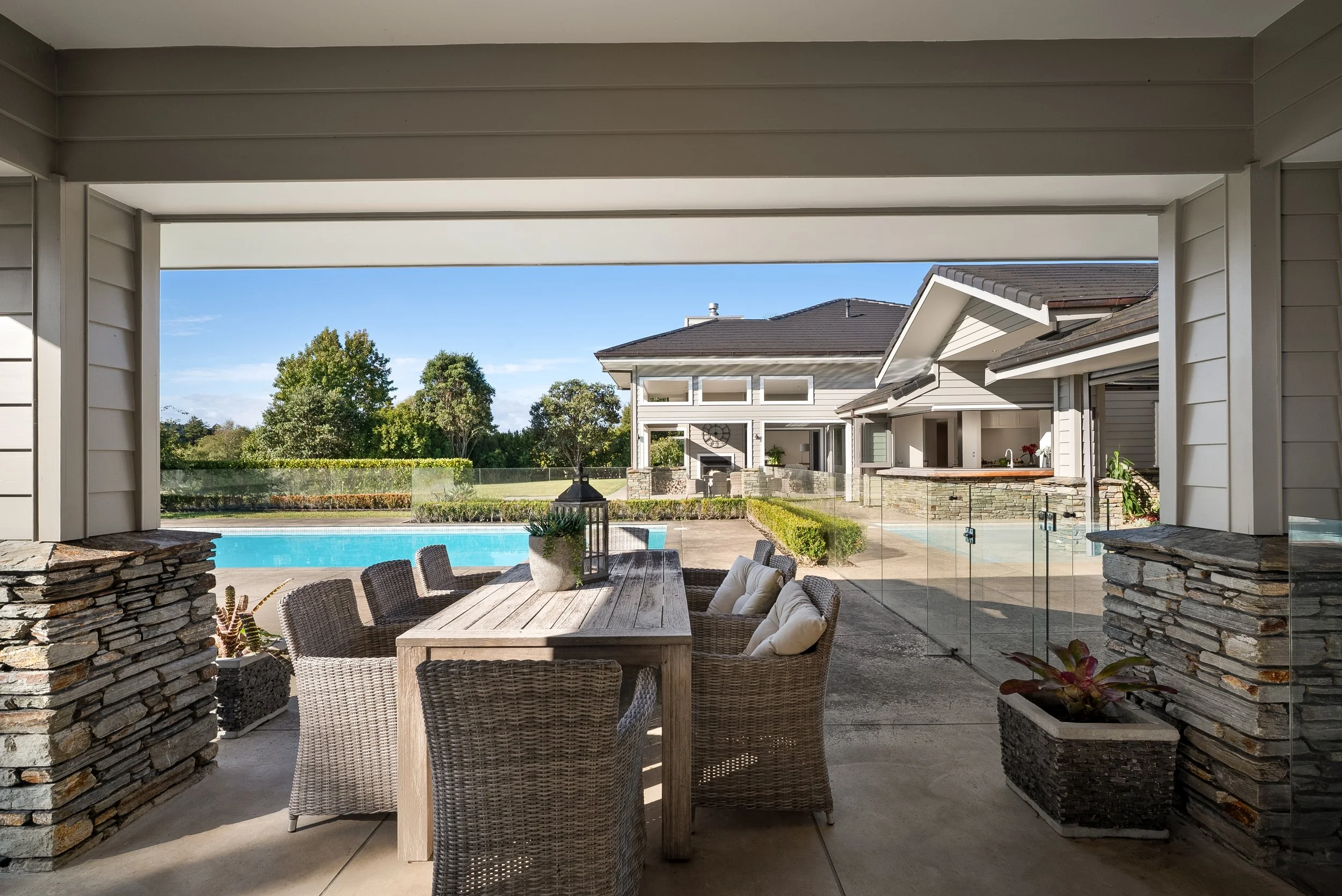 Framed by schist pillars and a grand entrance, the home opens into a cathedral-stud living space where oak floors and scale create an immediate sense of arrival. A full wall of glass draws your eye outward, to the pool, terrace, and 2.26 hectares of rolling Coatesville land in one uninterrupted view.