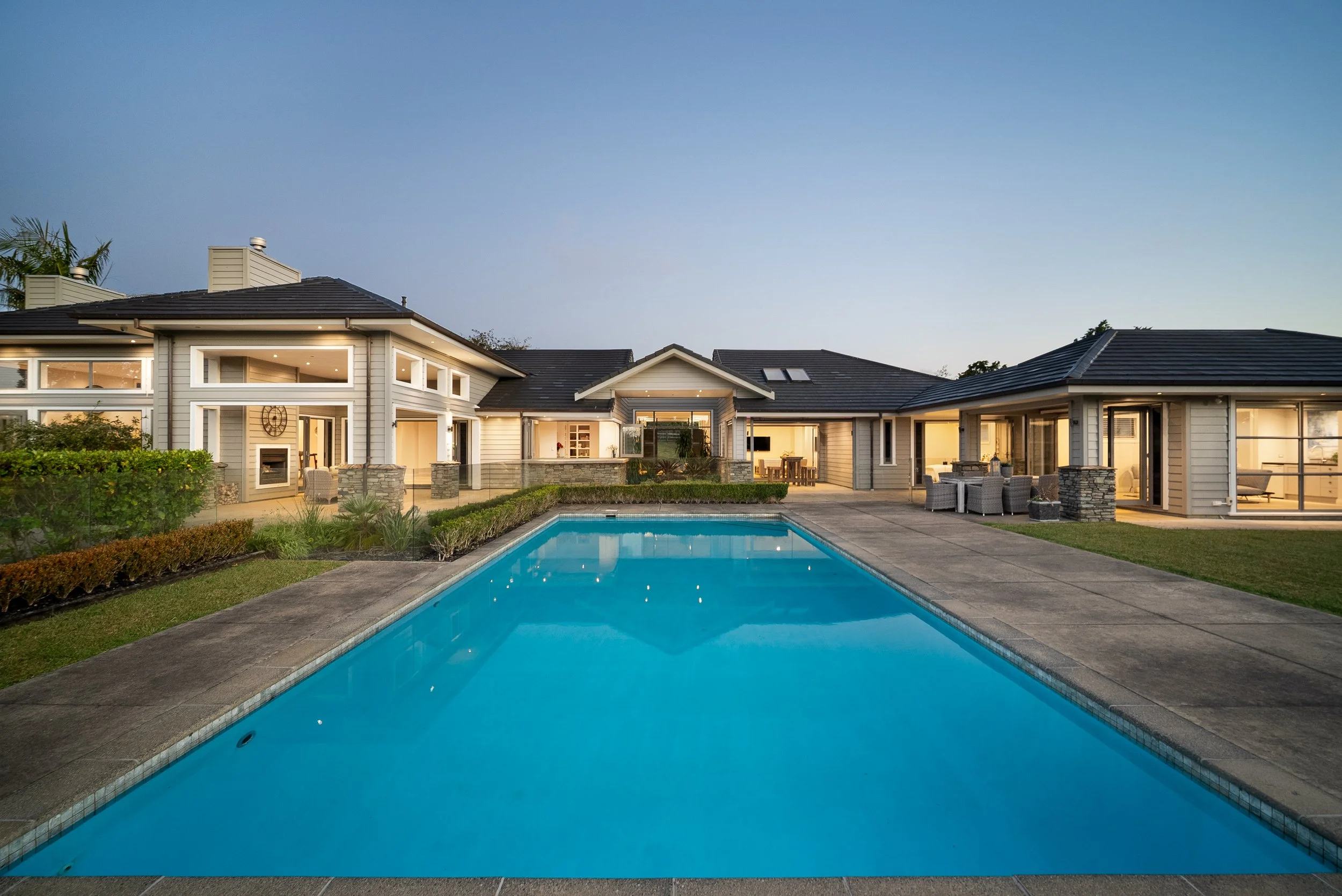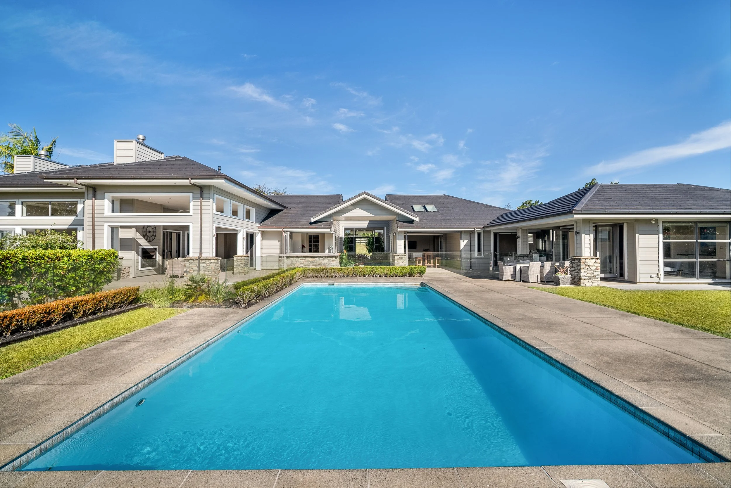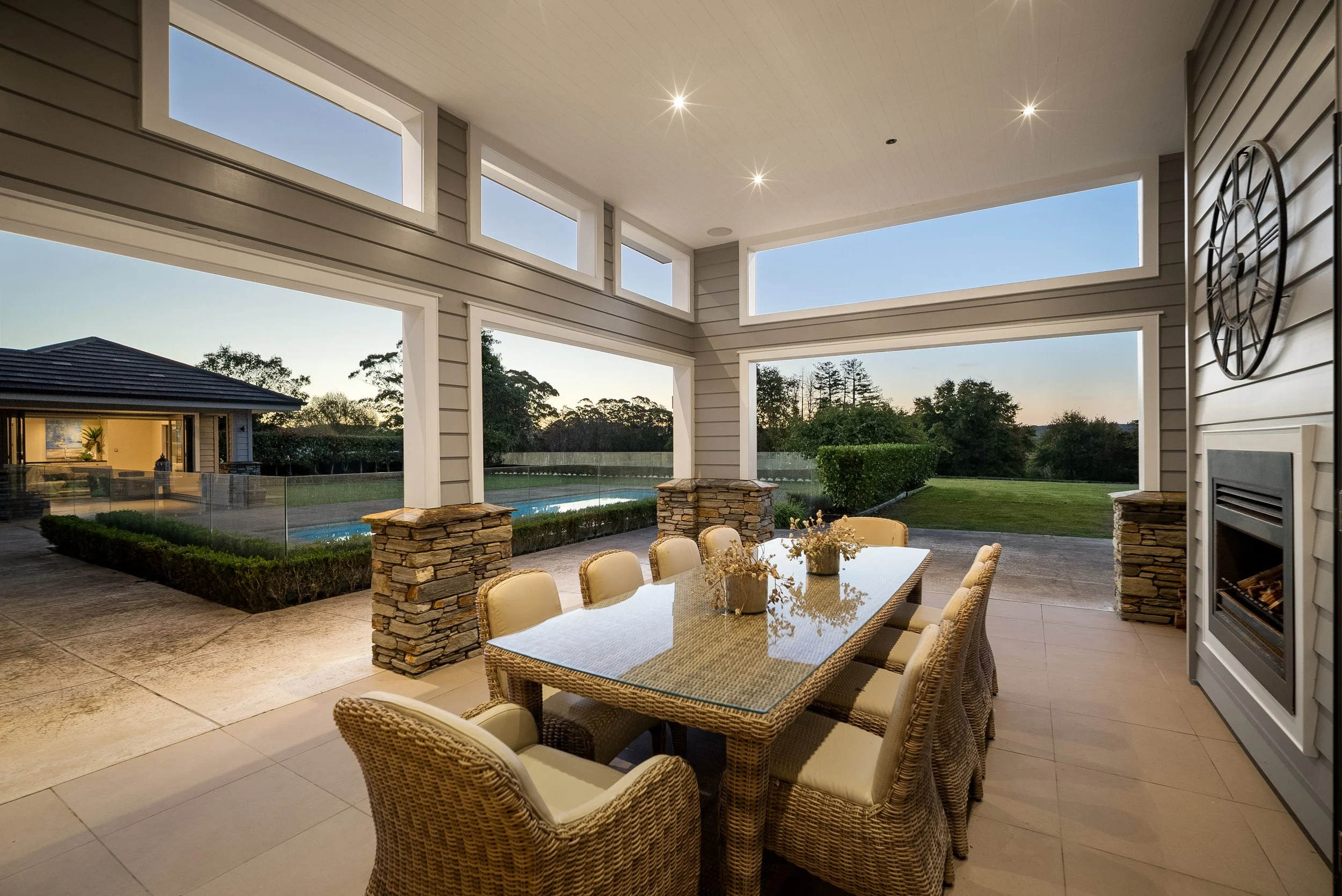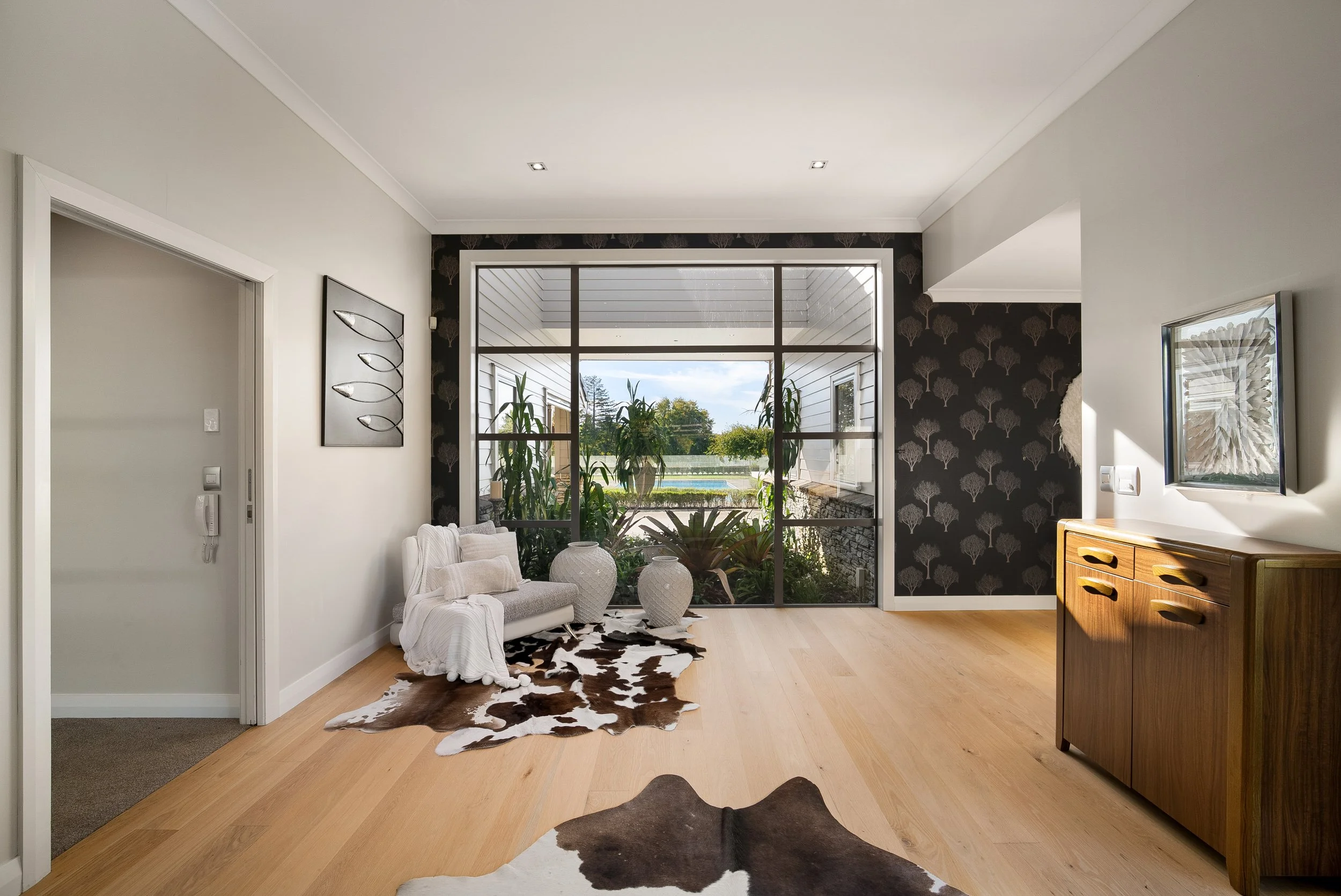 Framed by schist pillars and a grand entrance, the home opens into a cathedral-stud living space where oak floors and scale create an immediate sense of arrival. A full wall of glass draws your eye outward, to the pool, terrace, and 2.26 hectares of rolling Coatesville land in one uninterrupted view.