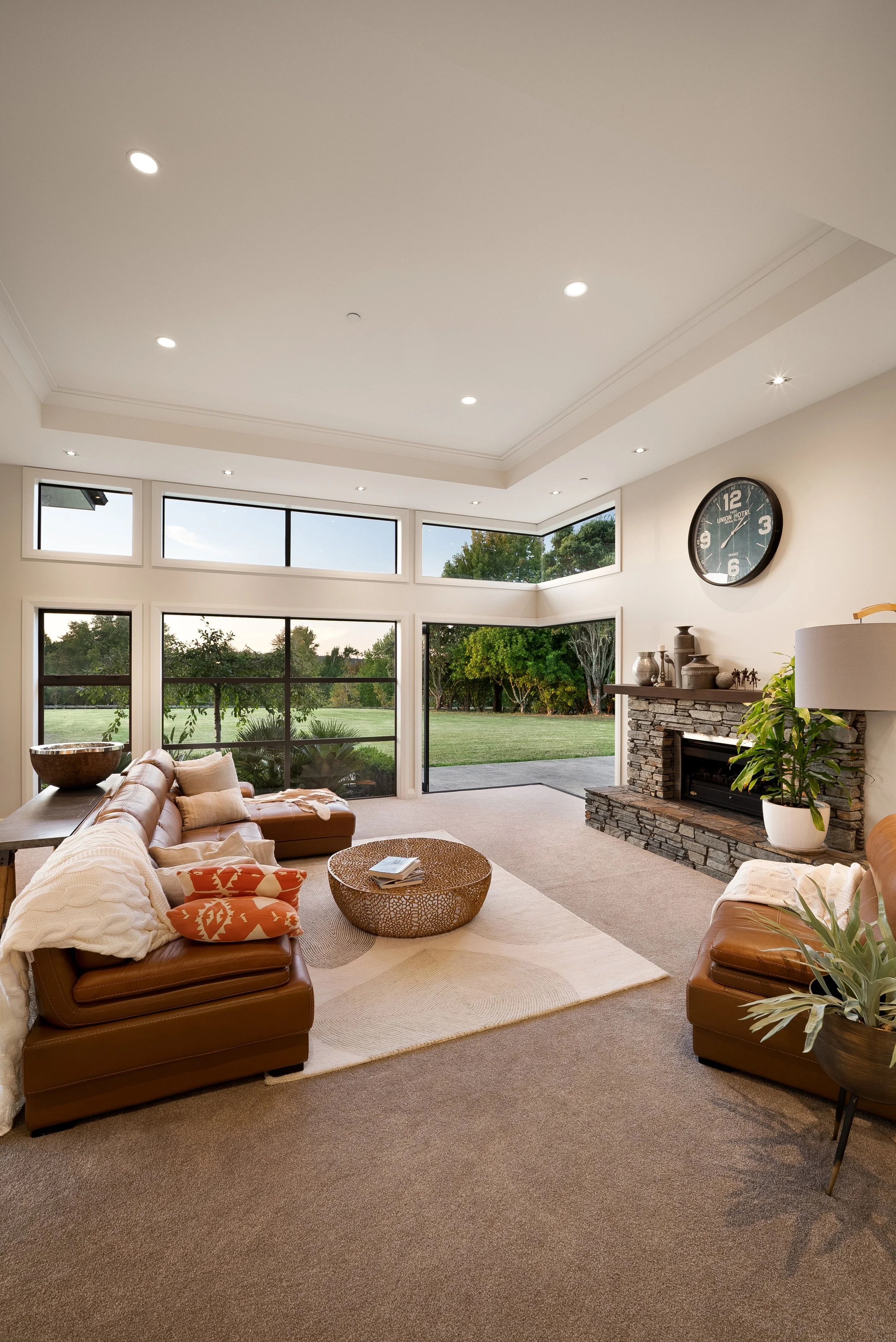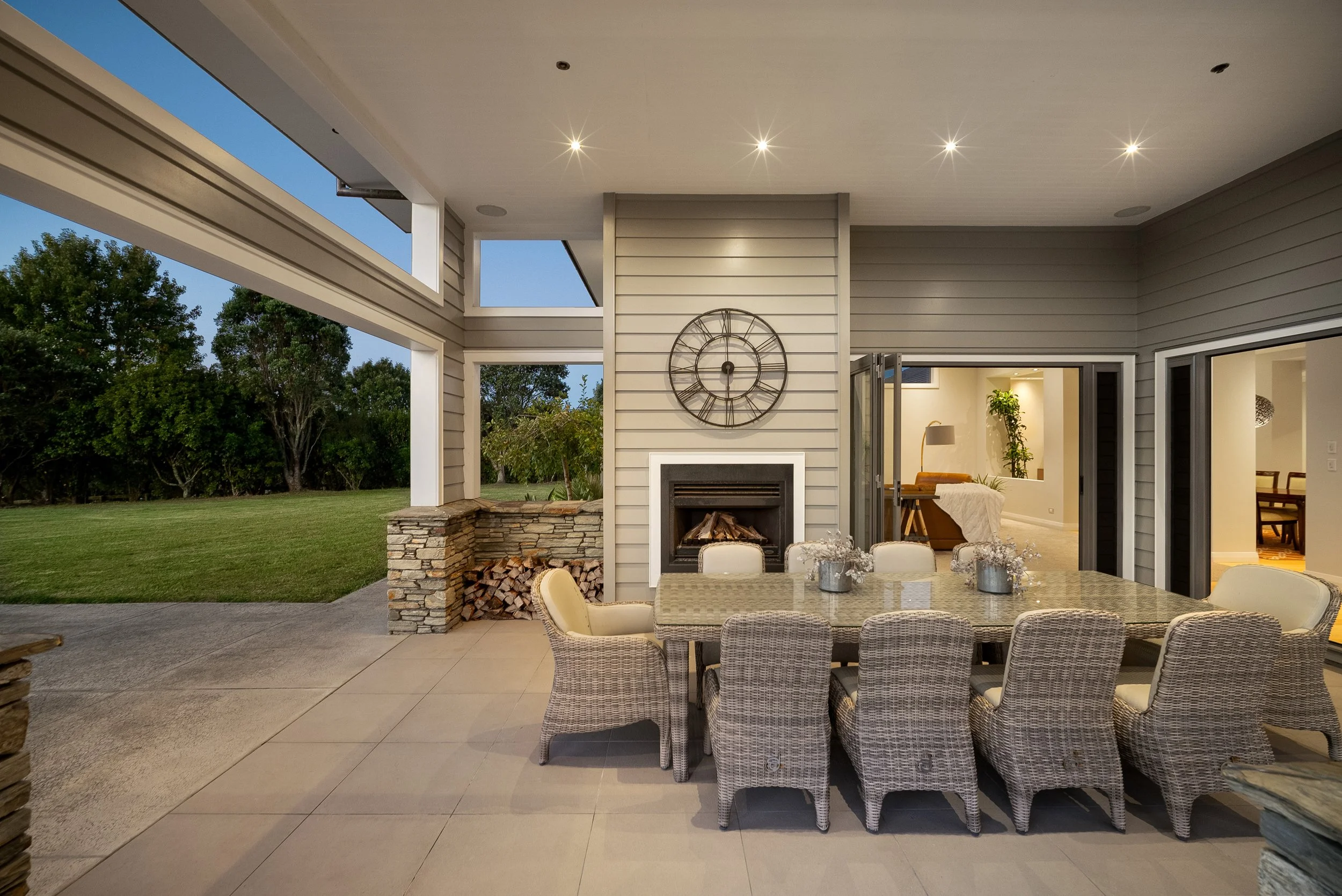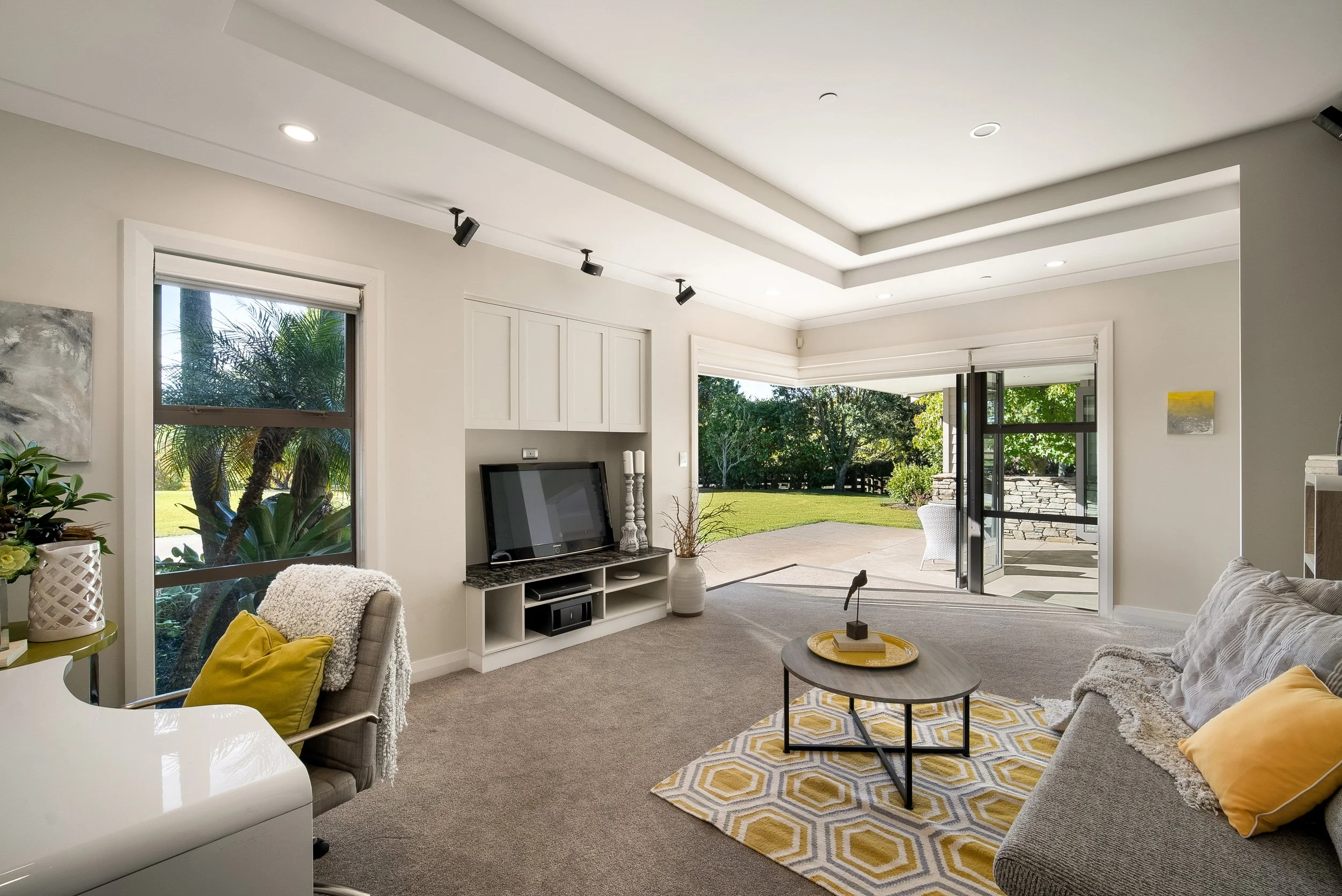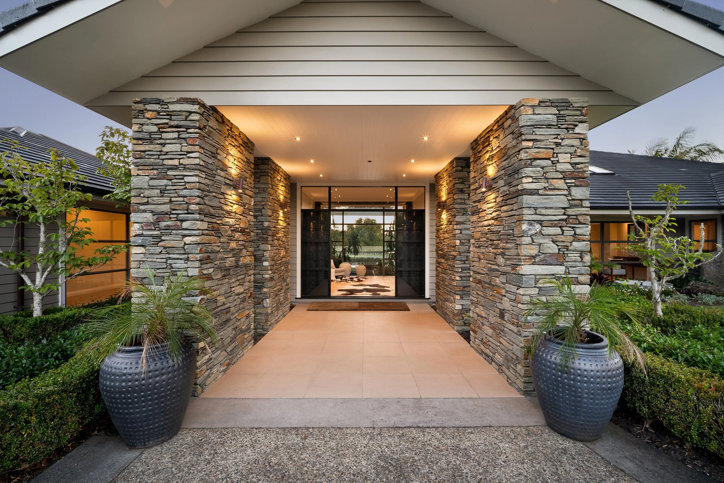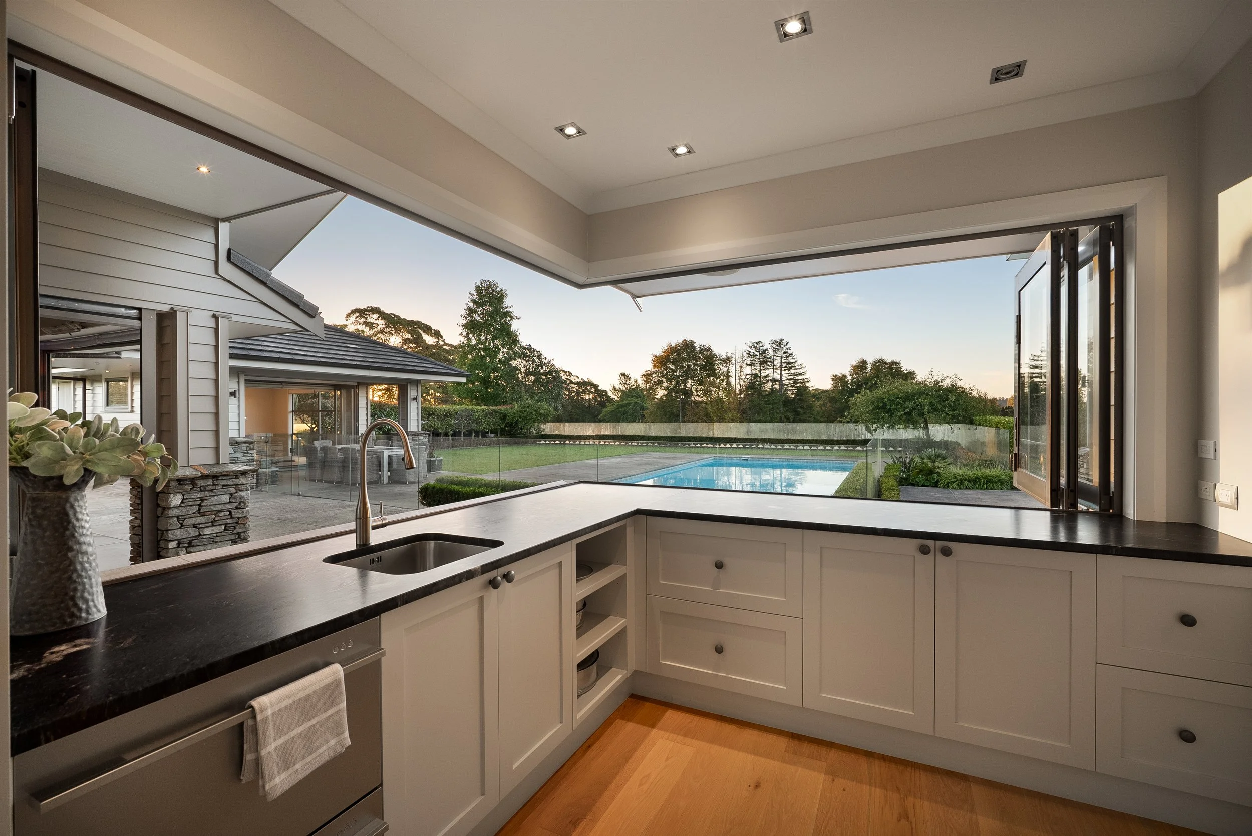 Framed by schist pillars and a grand entrance, the home opens into a cathedral-stud living space where oak floors and scale create an immediate sense of arrival. A full wall of glass draws your eye outward, to the pool, terrace, and 2.26 hectares of rolling Coatesville land in one uninterrupted view.