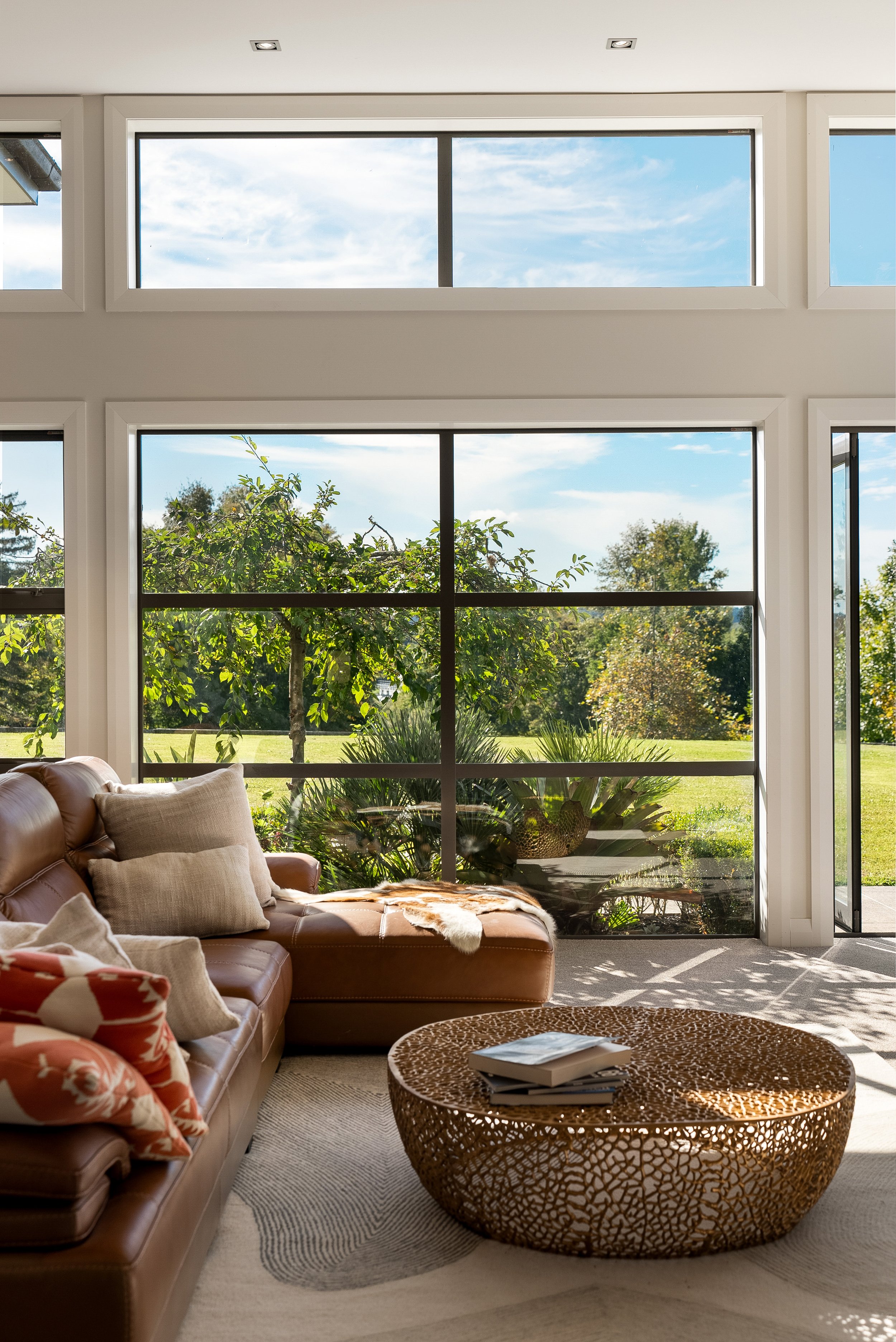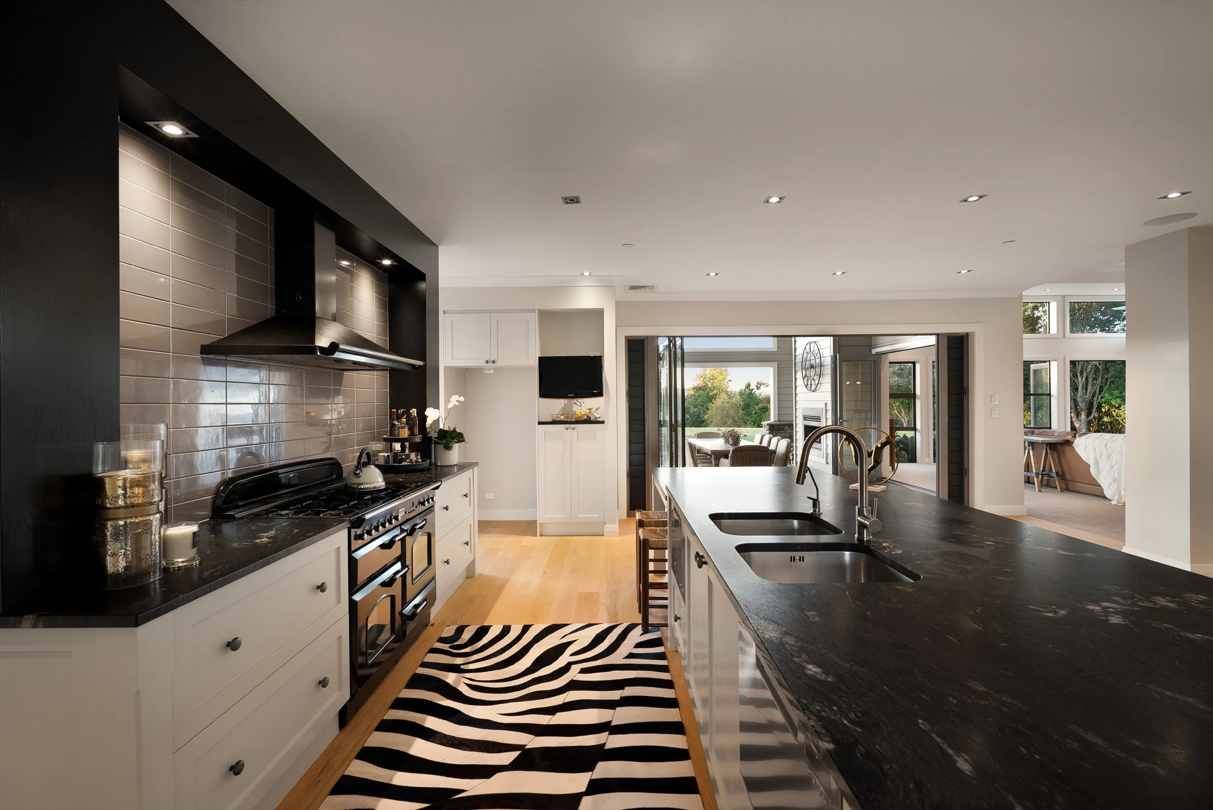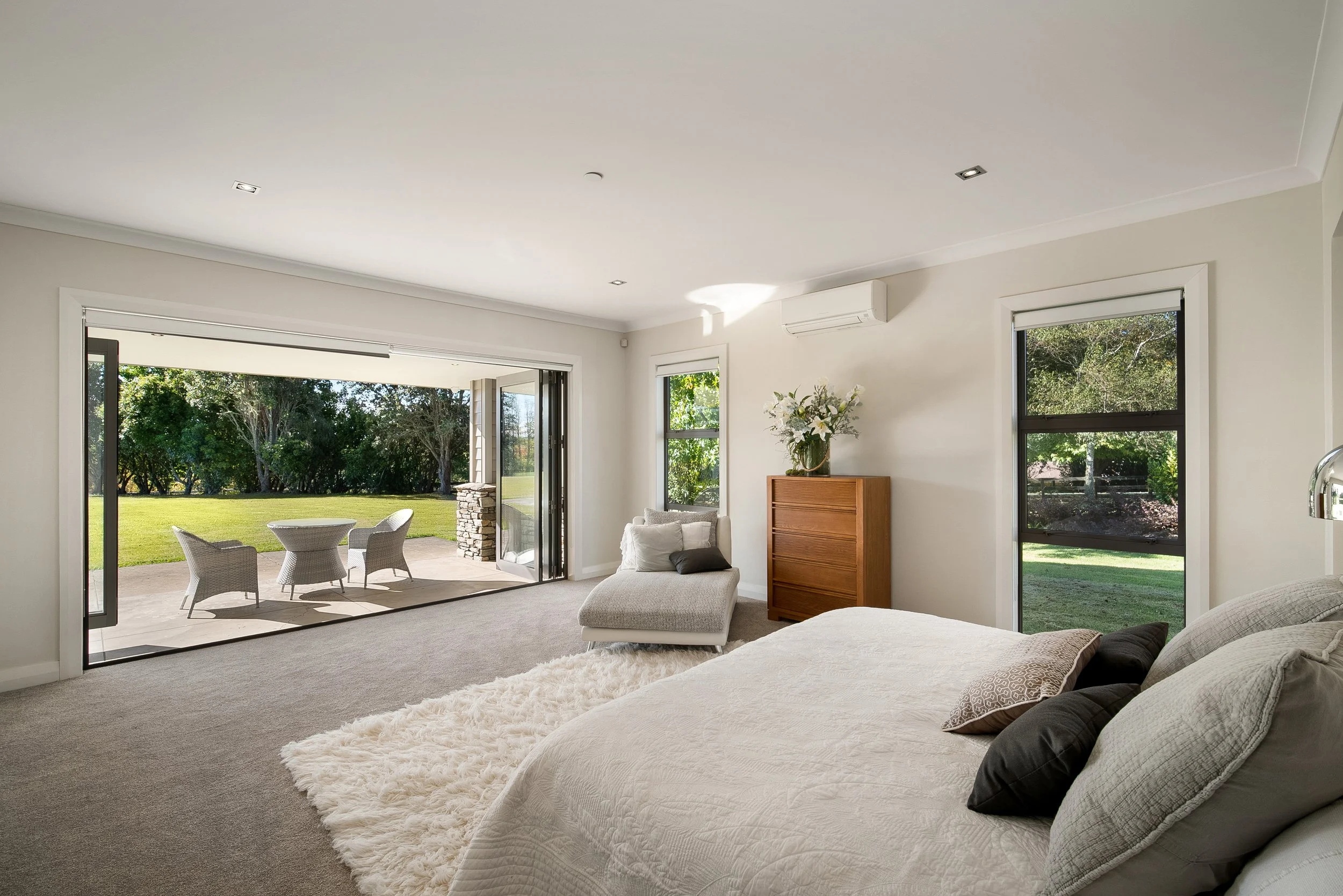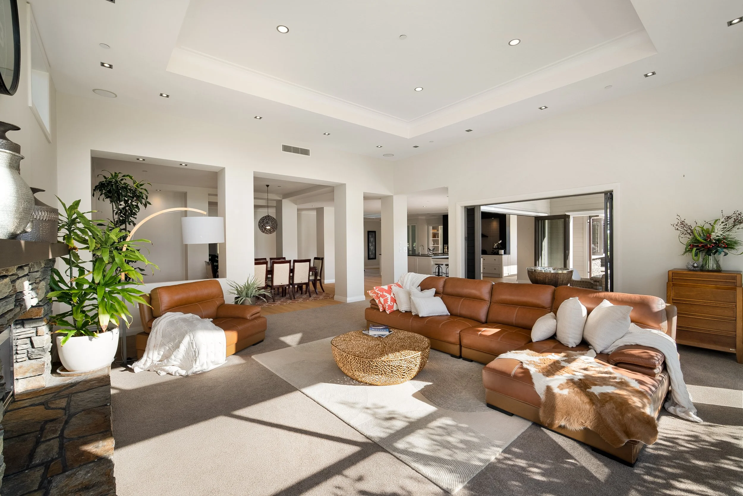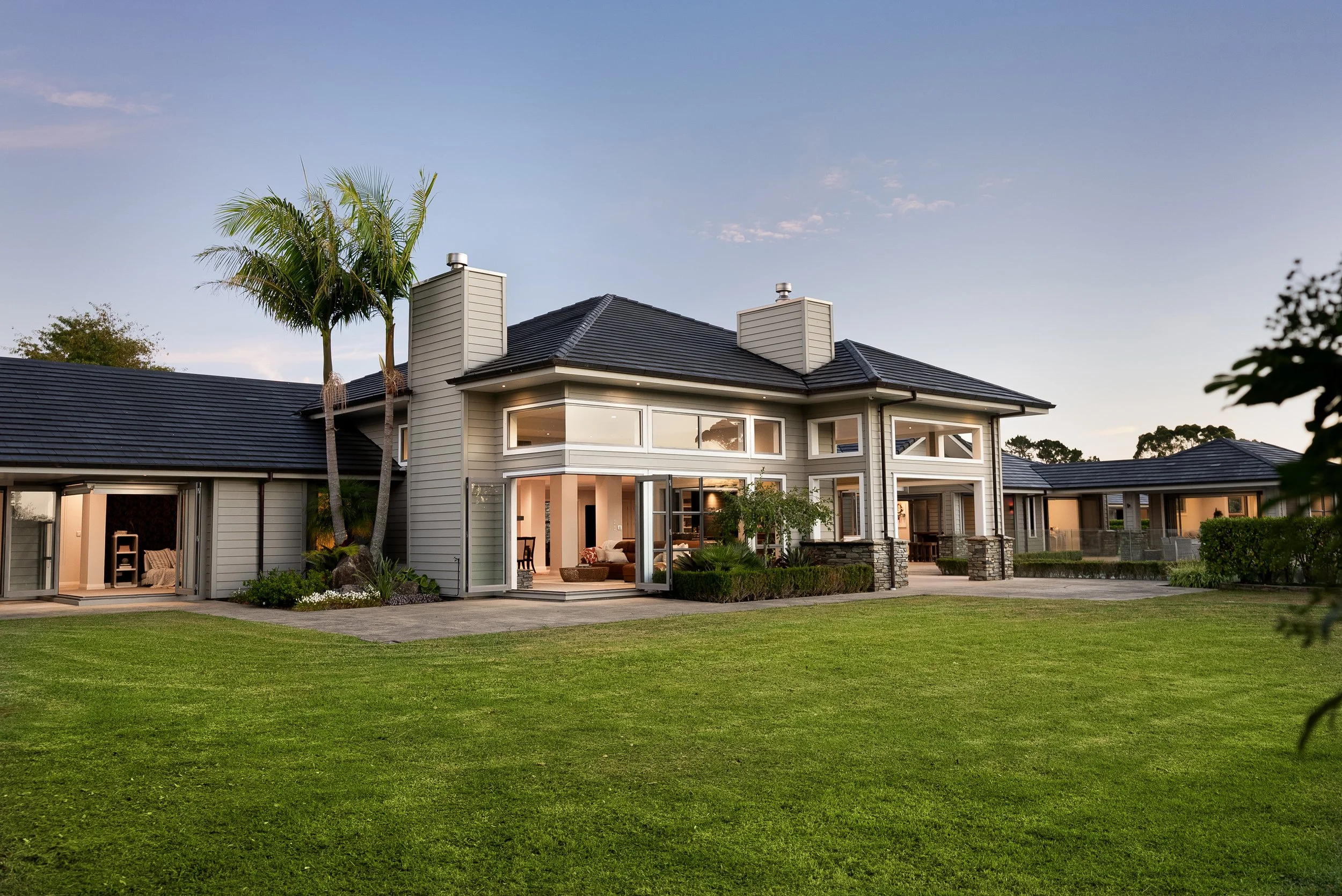 Framed by schist pillars and a grand entrance, the home opens into a cathedral-stud living space where oak floors and scale create an immediate sense of arrival. A full wall of glass draws your eye outward, to the pool, terrace, and 2.26 hectares of rolling Coatesville land in one uninterrupted view.