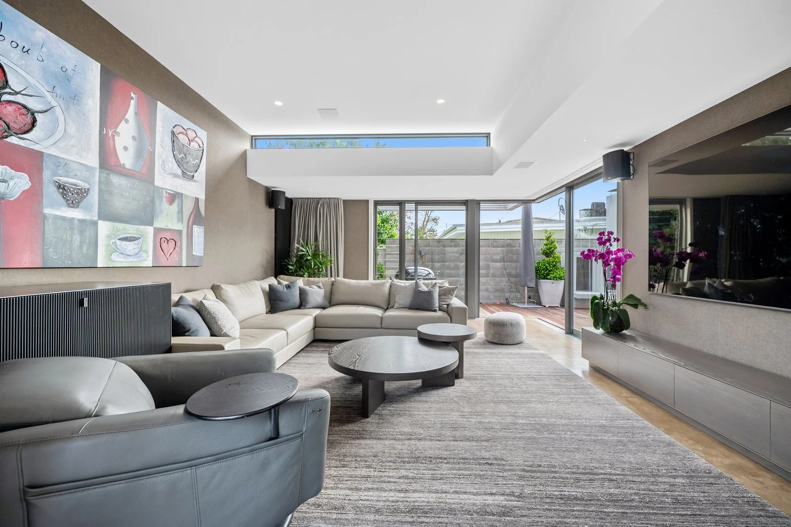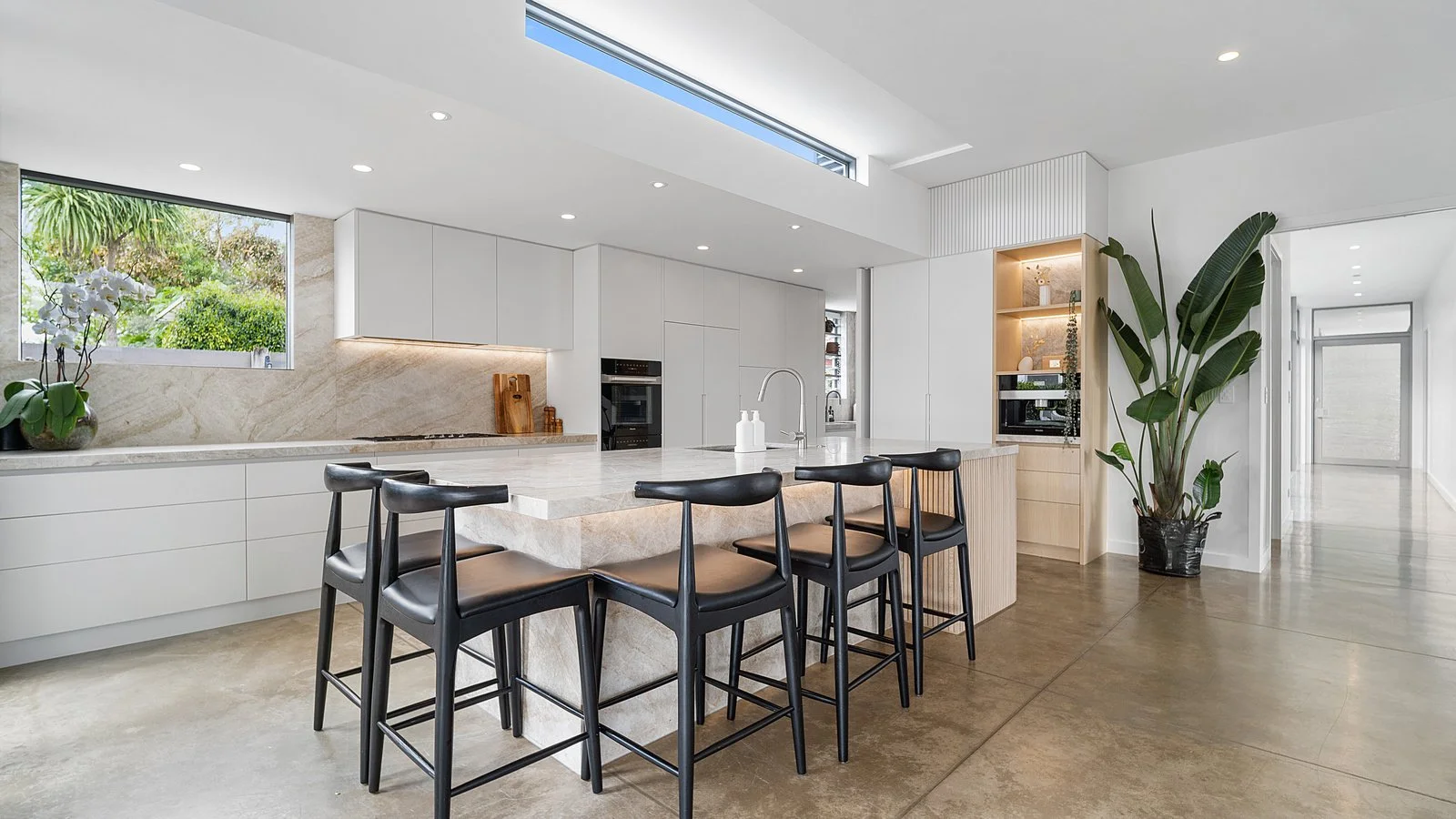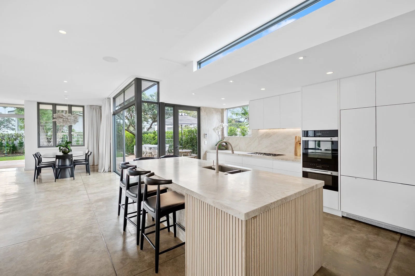 A 20 metre freshwater statement pool, crafted in shotcrete, anchors the outdoor environment and enhances the sense of resort like tranquillity. Underfloor heating throughout the home ensures comfort across every season, while acoustic treatments and thoughtful spatial planning create a sense of calm rarely found in modern homes. Rather than chasing scale, the design focuses on balance, symmetry, and clarity of form. Light moves through the home effortlessly, framed by expansive joinery and carefully curated materials including plaster over Hebel, brick, and Abodo timber cladding. Every detail has been considered, from the pencil line architectural detailing to the warmth of the walnut kitchen and high end finishes throughout.