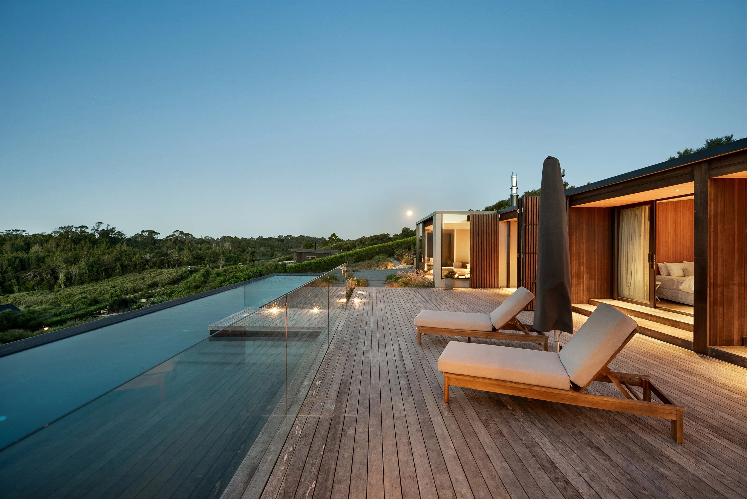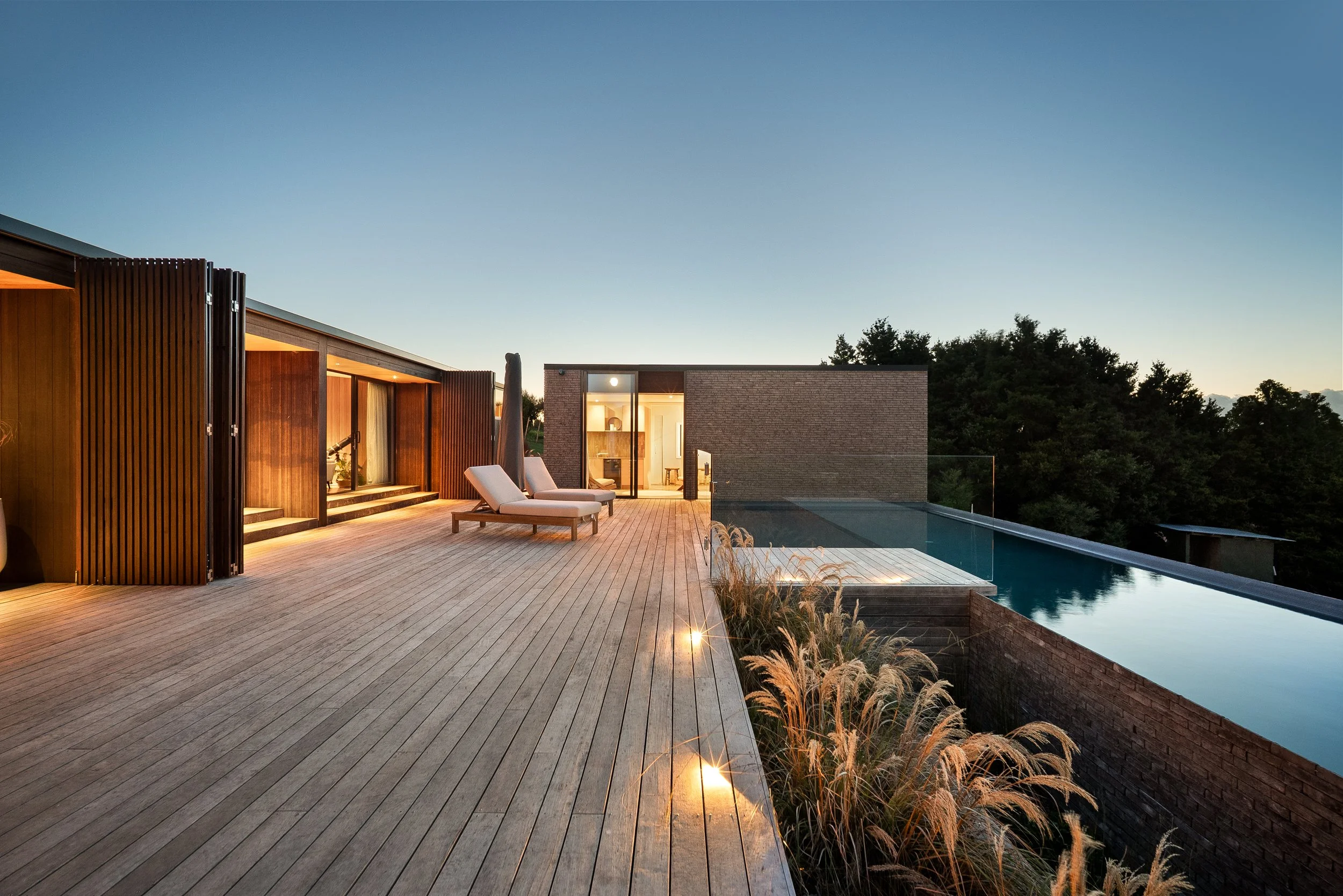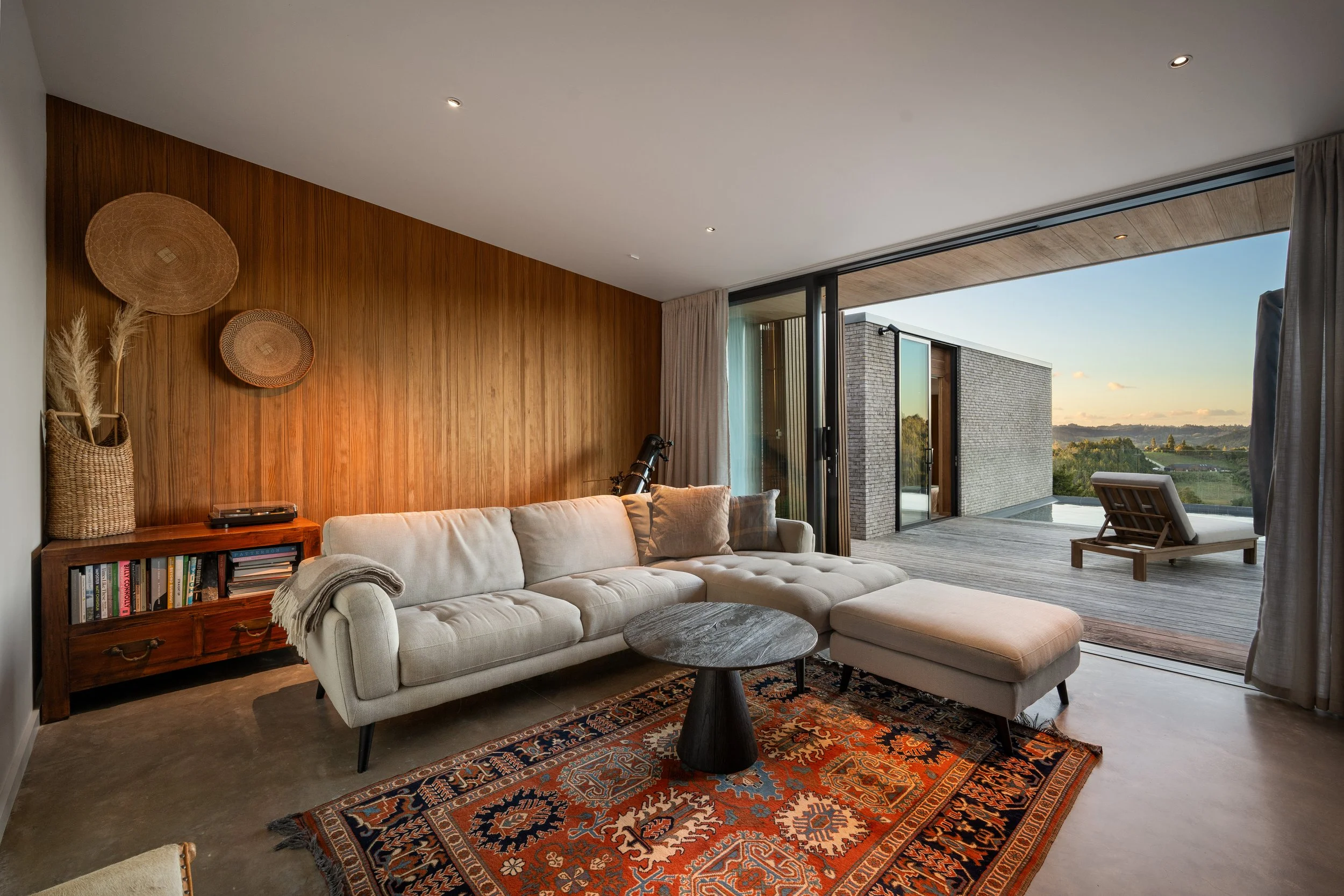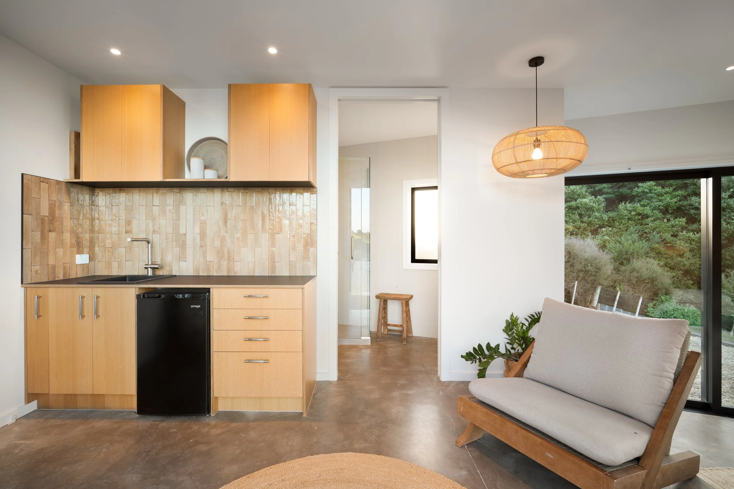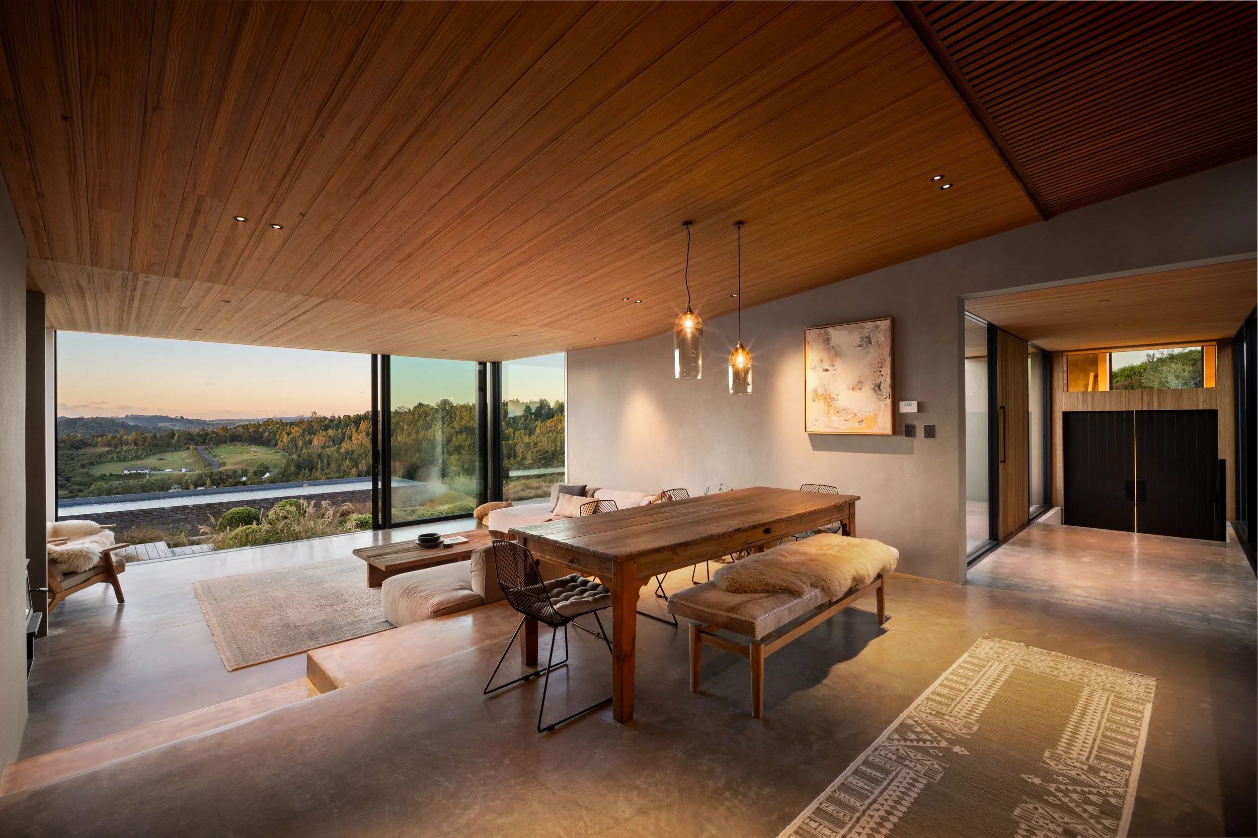 The approximately 352sqm residence unfolds with calm simplicity. Living spaces connect seamlessly to the outdoors, where around 150sqm of decking captures the surrounding views and provides multiple settings for entertaining or quiet retreat. Accommodation includes a two to three bedroom main residence alongside a separate studio, offering flexibility for guests, creative work, or private retreat.