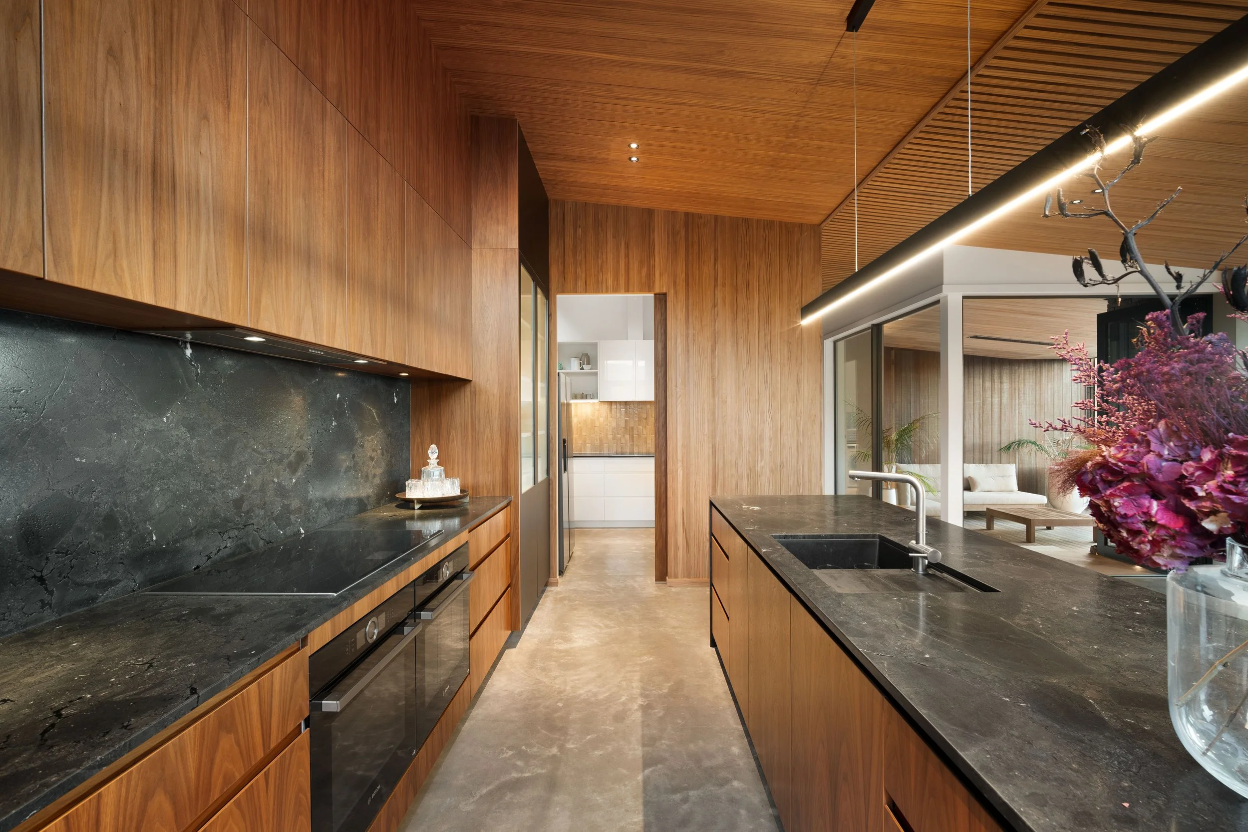 A 20 metre freshwater statement pool, crafted in shotcrete, anchors the outdoor environment and enhances the sense of resort like tranquillity. Underfloor heating throughout the home ensures comfort across every season, while acoustic treatments and thoughtful spatial planning create a sense of calm rarely found in modern homes. Rather than chasing scale, the design focuses on balance, symmetry, and clarity of form. Light moves through the home effortlessly, framed by expansive joinery and carefully curated materials including plaster over Hebel, brick, and Abodo timber cladding. Every detail has been considered, from the pencil line architectural detailing to the warmth of the walnut kitchen and high end finishes throughout.